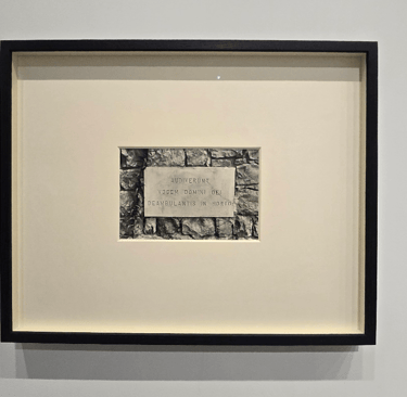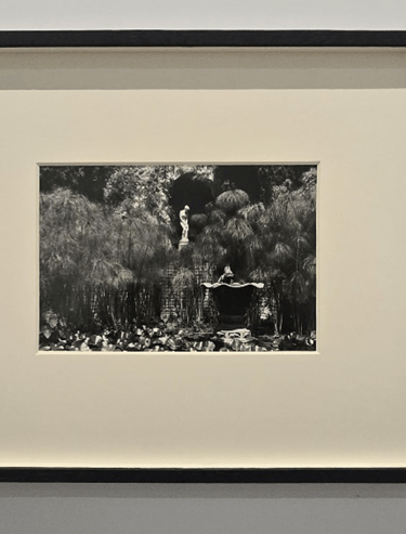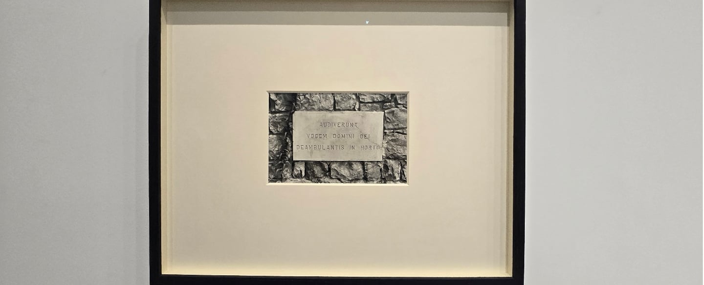 L’exposition s’ouvre sur la photographie d’une inscription latine gravée dans le marbre, scellée à un mur de pierre : « Ils entendirent la voix du Seigneur Dieu qui marchait dans le jardin », extrait de la Bible latine.